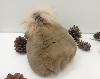 Handmade Velvet Nutria Fur Beanie: Pink-Brown Fox Fur Pompom